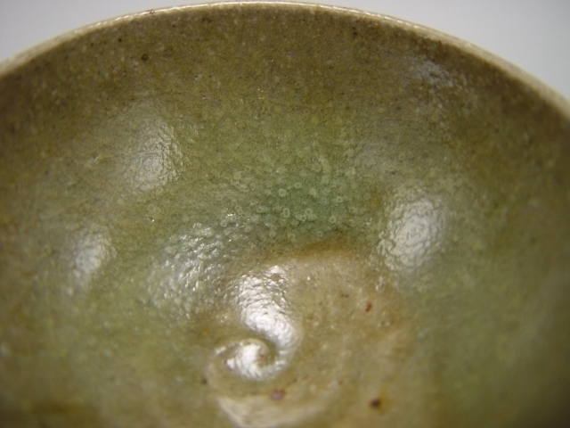 轆轤成型を終えた器はまず糸を使って土より切り離します。切り口は糸切り痕となります、唐津の山盃は雑器として作られたものなので高台は作られていないようです。